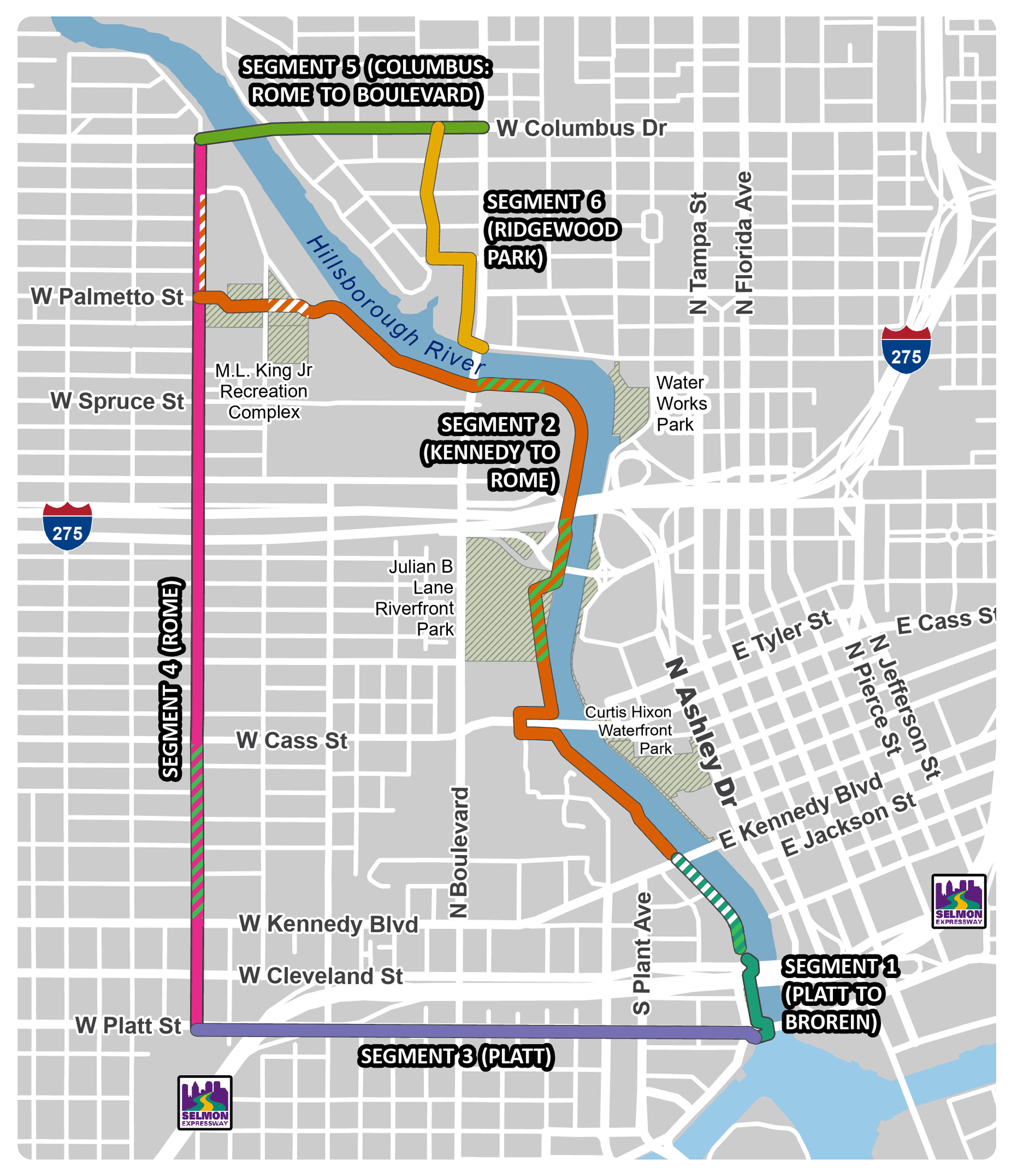 The Tampa Multimodal Network and Safety Improvement Project consists of 6 unique segments that combine to create a new, 12.2-mile active transportation corridor that celebrates the Hillsborough River, providing enhanced connectivity, safety, livability, and economic opportunity for downtown and its surrounding neighborhoods.